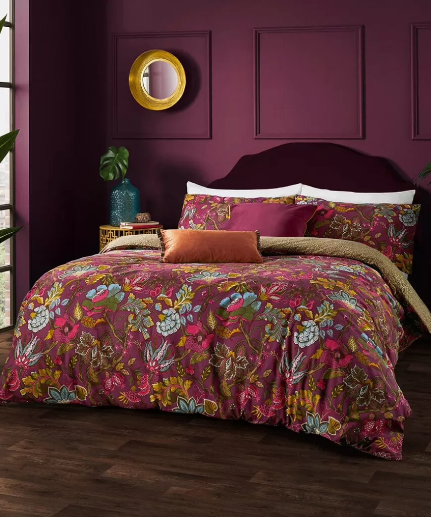 Dive into a world of vibrant beauty with this exotic floral, reversible duvet set, inspired by the wondrous Arts and Crafts movement. Bold blooms dance against a spotted tonal reverse, creating a fabulous fusion of nature and artistry. Printed on soft cotton rich fabric with a textured finish, it’s a lively tribute to timeless design that’ll brighten up any bedroom effortlessly.