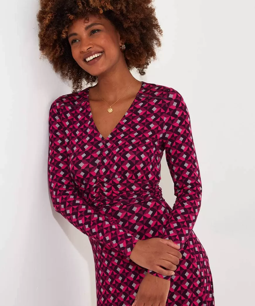 Elevate your winter wardrobe with this gorgeous geo jersey dress. With a bold colour and captivating printit’ll instantly make an impact wherever you wear it. Super soft with flattering ruching and an elegant V neckits sure to be your new go to style this season.
