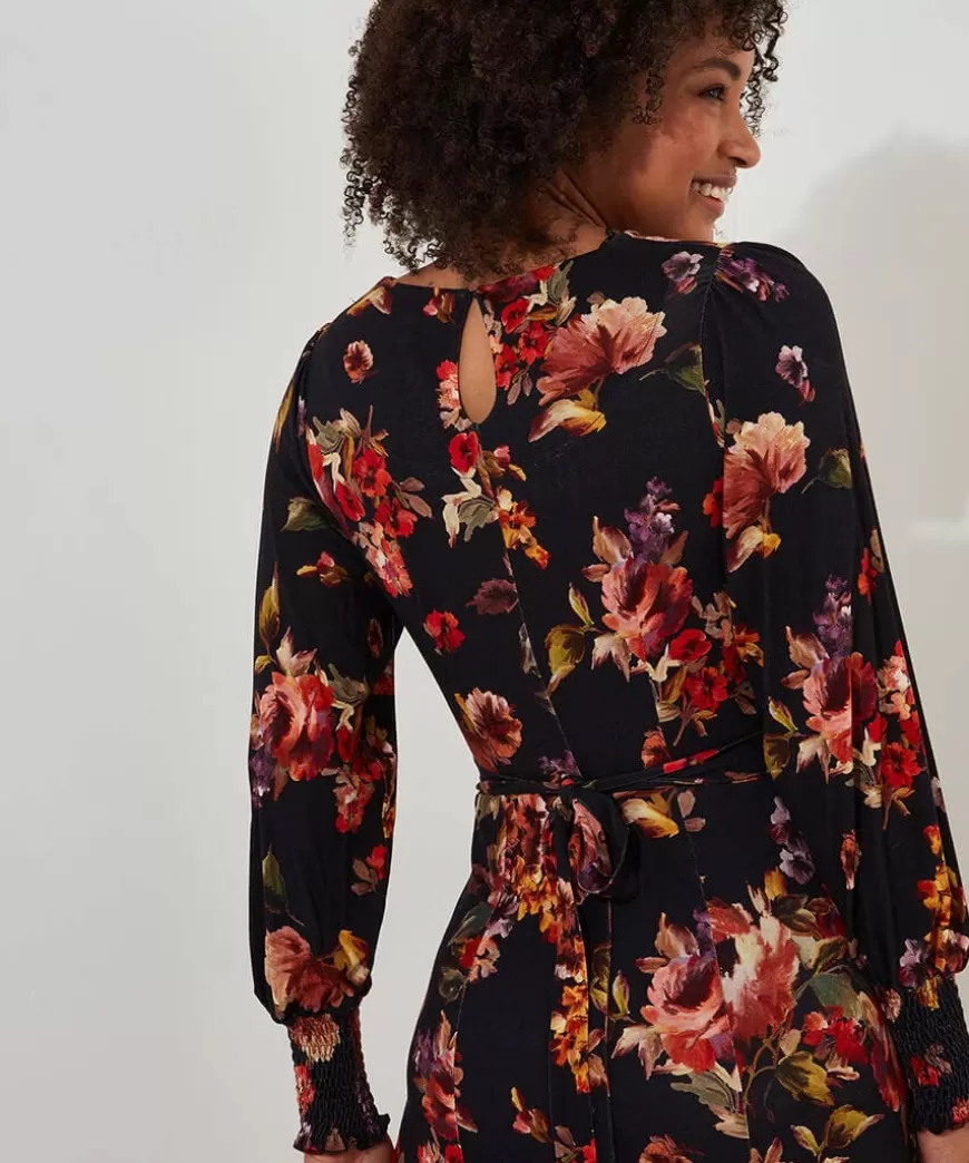 For effortless autumn styling, choose this floral dress. See how the red tones pop against the black jersey fabric? The perfect way to uplift boots and a denim jacket, it’ll instantly breathe new life into your winter wardrobe. With hem splits and back waist ties for a flattering shape and comfortable fit, this dress really does have it all!